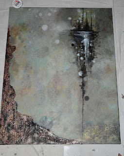 I am taking an online class called Patina and Vertigris and so far it has been an "experience". Stepping out of my comfort zone..... The bottom picture is where i started and hated so much brassy gold so I tamed it down and then things just began happening. I am also working on a larger canvas than I normally do so that in itself has created a bit of fear..... I am enjoying the process and I have no idea where I will end up...... Tonight I added a layer of modeling paste on the left hand side and bottom of the top canvas and applied a Hieroglyphic stamp to see how it would imprint. Something else that is new for me. Tomorrow when it is dry I am going to paint it and then add a patina to it. I think I am going to do bronze and the teal color and then go over the top with some black...... I have a 2nd canvas that is waiting for me done in silver, teal and black and it will need some enhancing also ..........
